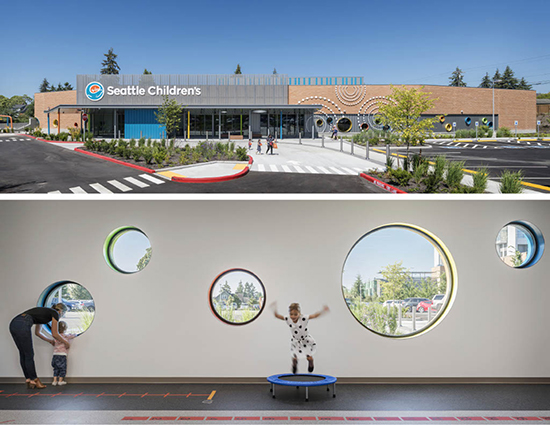 Clad in textured brick, the North Clinic shares its design vernacular with the brick facades of the adjacent Providence buildings and central utility plant. Every detail down to the color of the brick was coordinated with Seattle Children’s and Providence in mind, resulting in a building that reflects both organizations and cultures coming together on a shared campus while maintaining Seattle Children’s brand.
