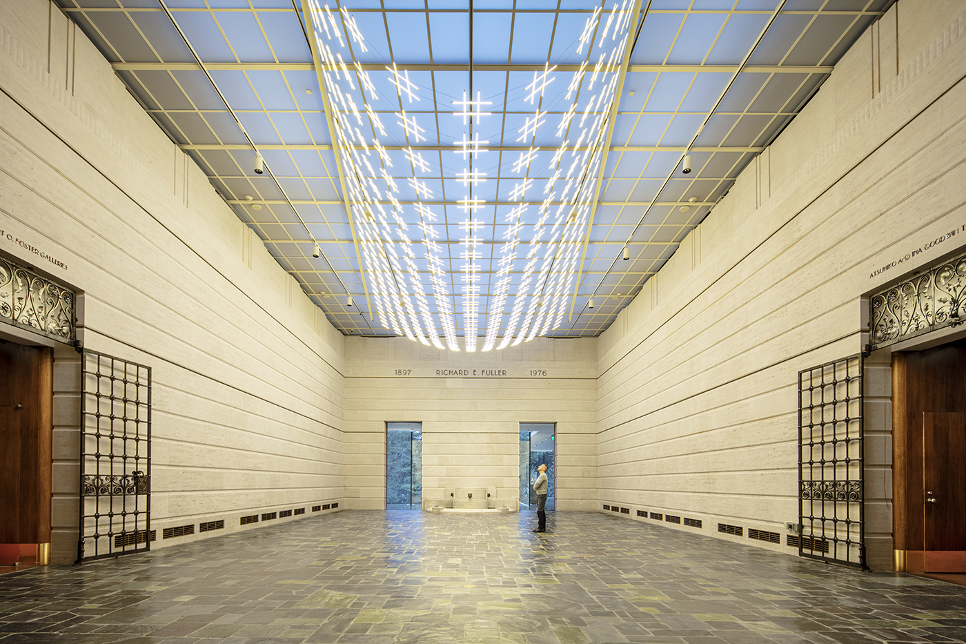 LMN designers said they recognized that Fuller Garden Court was a central hub and pivot point to galleries and the new Park Lobby, which visually connects the museum to the east side of the park. It also creates a vertical circulation system, via staircases, to program spaces and is composed mostly of glass creating the impression that it is floating in space, according to Pautz and Miller.