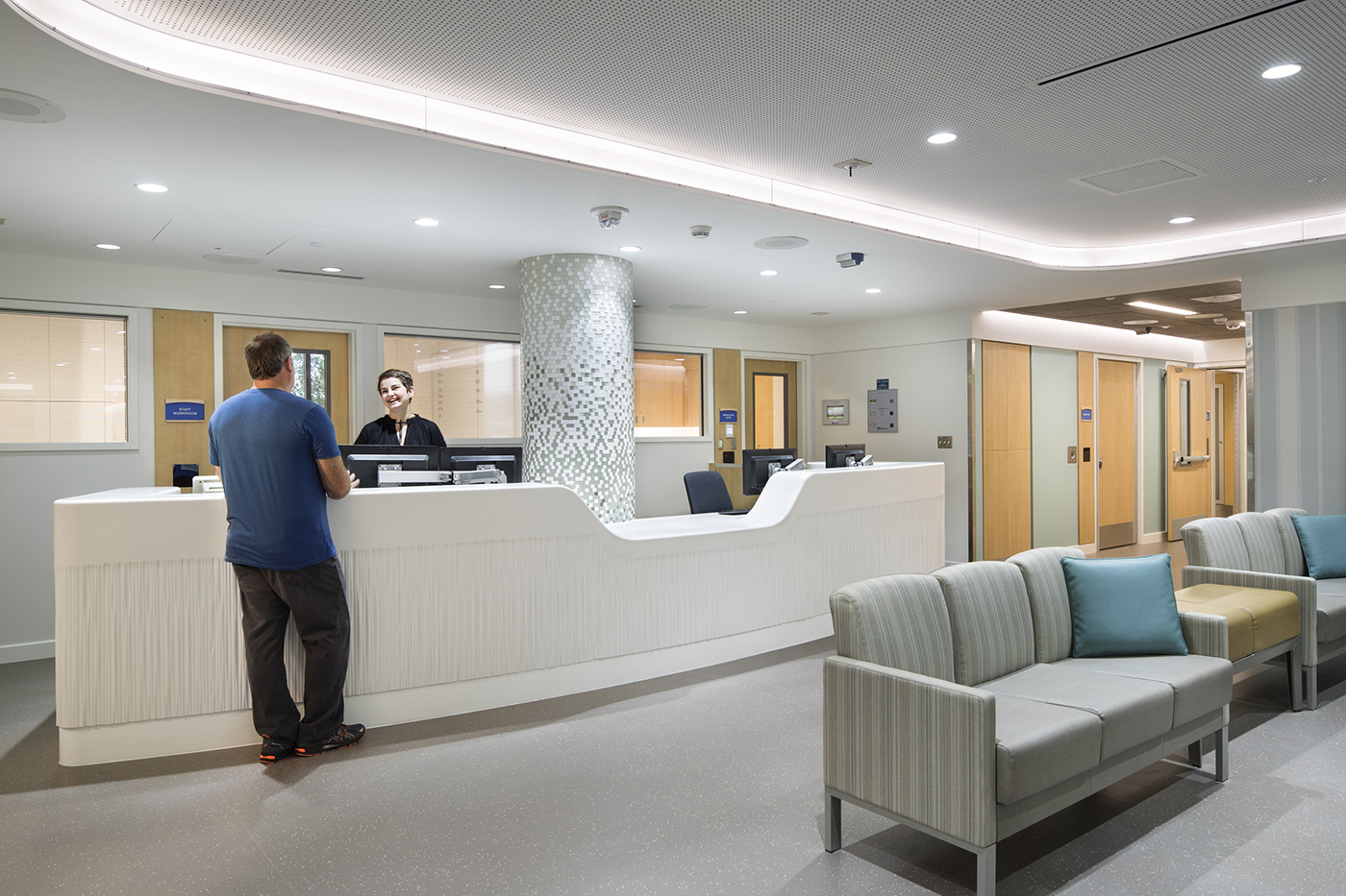 The desk also doubles as a potential barrier between patients and staff, when needed. This presents a welcome departure from the more familiar depictions in movies, where nurses are seated behind a wire-glass enclosure. We sought to strike a balance between size and durability needs with a desire to project a warm, welcoming, and comforting environment.