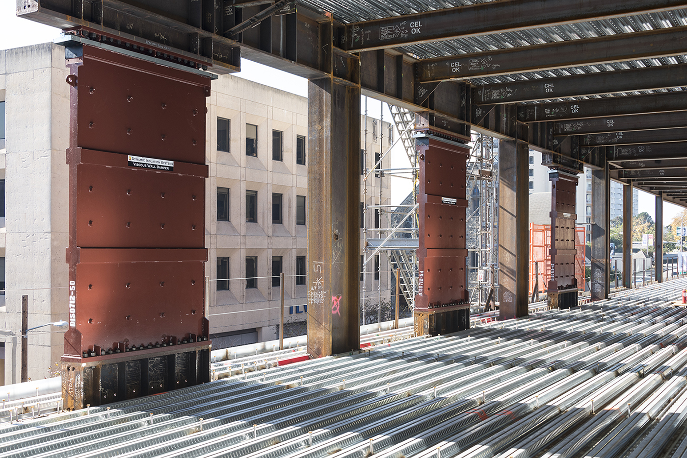 Structural engineers proposed a hybrid steel moment-frame design incorporating viscous wall dampers. Developed in Japan over the past 30 years, viscous wall dampers absorb strong movement and reduce overall stress on the building.