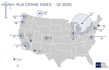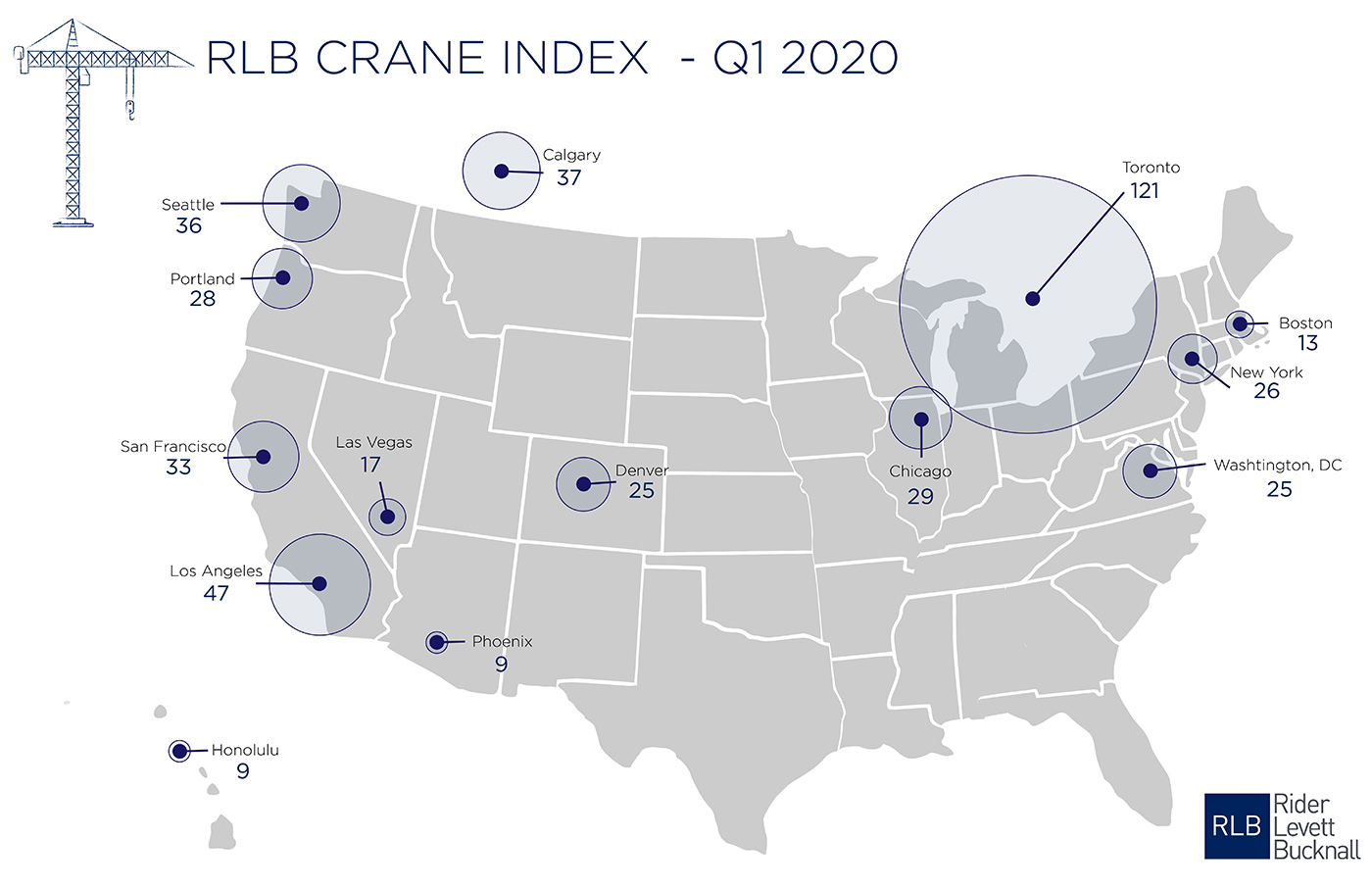 A report on the index from RLB said, “While Seattle's crane count takes a hard dive, with 13 fewer towers over the city, it still ranks among the top four North American cities surveyed in total cranes.”