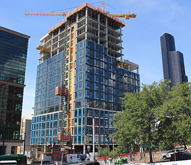 PCL Construction Services earlier this month topped out and completed the final concrete pour of the level 18 deck on the Koda condominium tower at 450 S. Main St. in Seattle.