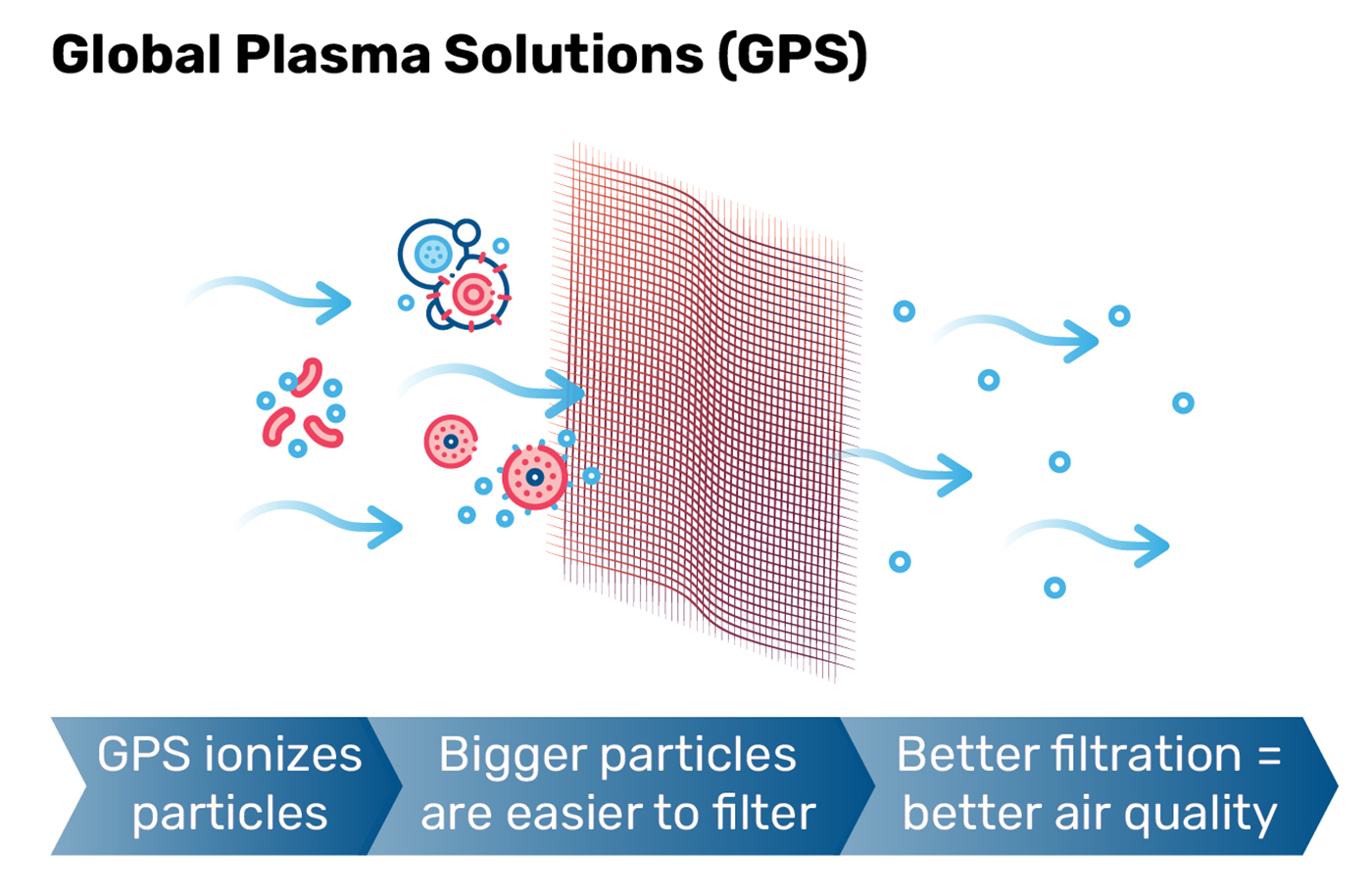 • Global Plasma Solutions: Global Plasma Solutions (GPS) can be added to the return air stream of a recirculating HVAC unit. GPS ionizes particles to cause them to stick to each other. This makes bigger particles that are easier to filter. Better filtration leads to better air quality. While the particles are collecting together, viruses may also be bound to the particle clusters and filter out of the airstream with greater effectiveness. GPS systems can easily be retrofitted into existing equipment, as well as new design.