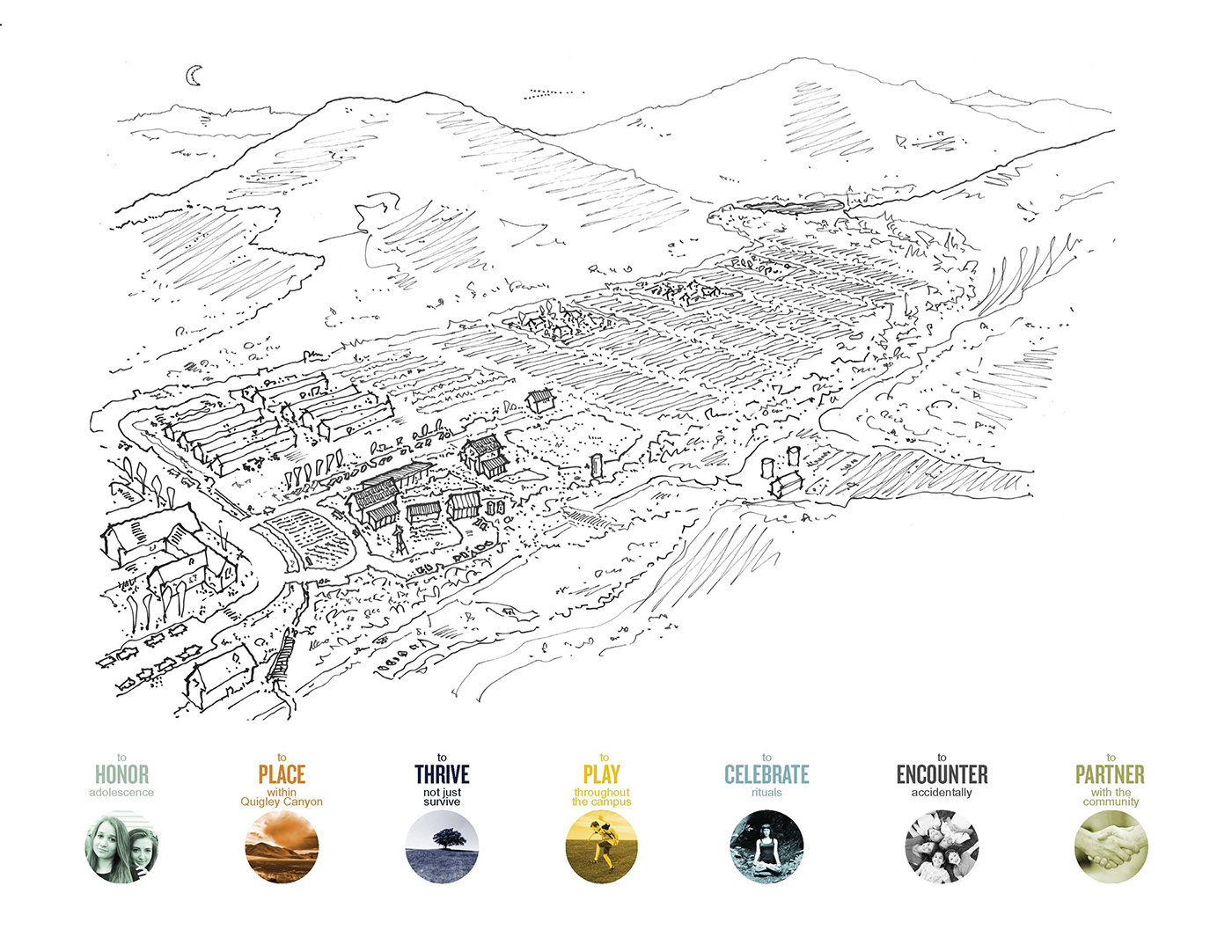 Architecturally, the buildings and grounds should not be too precious, but moments or elements should be precious enough to be special. Honor adolescence and keep the love of learning alive. Design the campus to integrate the latest in ecological design borrow from the characteristic of emergence that develops from a relationship. Community connections are a must educate the community and build a more humane reality for kids.