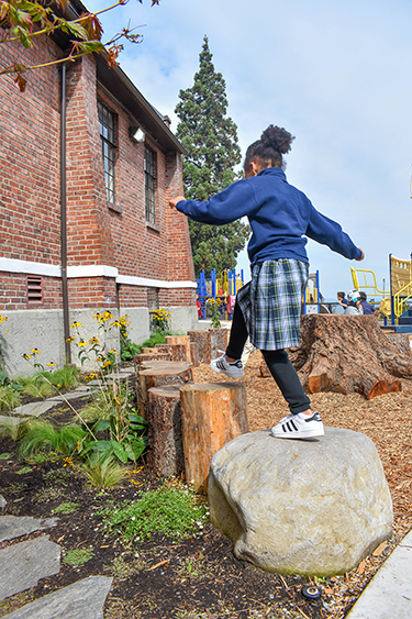 Outdoor learning environments can take vastly different forms, from wide-open fields and wooded areas to nearby open spaces and public parks. At the Annie Wright School in Tacoma, outdoor learning was identified as a primary goal of a recent playground upgrade. In order to accommodate the school’s International Baccalaureate program and its emphasis on outdoor learning, AHBL landscape architects created a natural area to invite exploration, curiosity and creativity.
