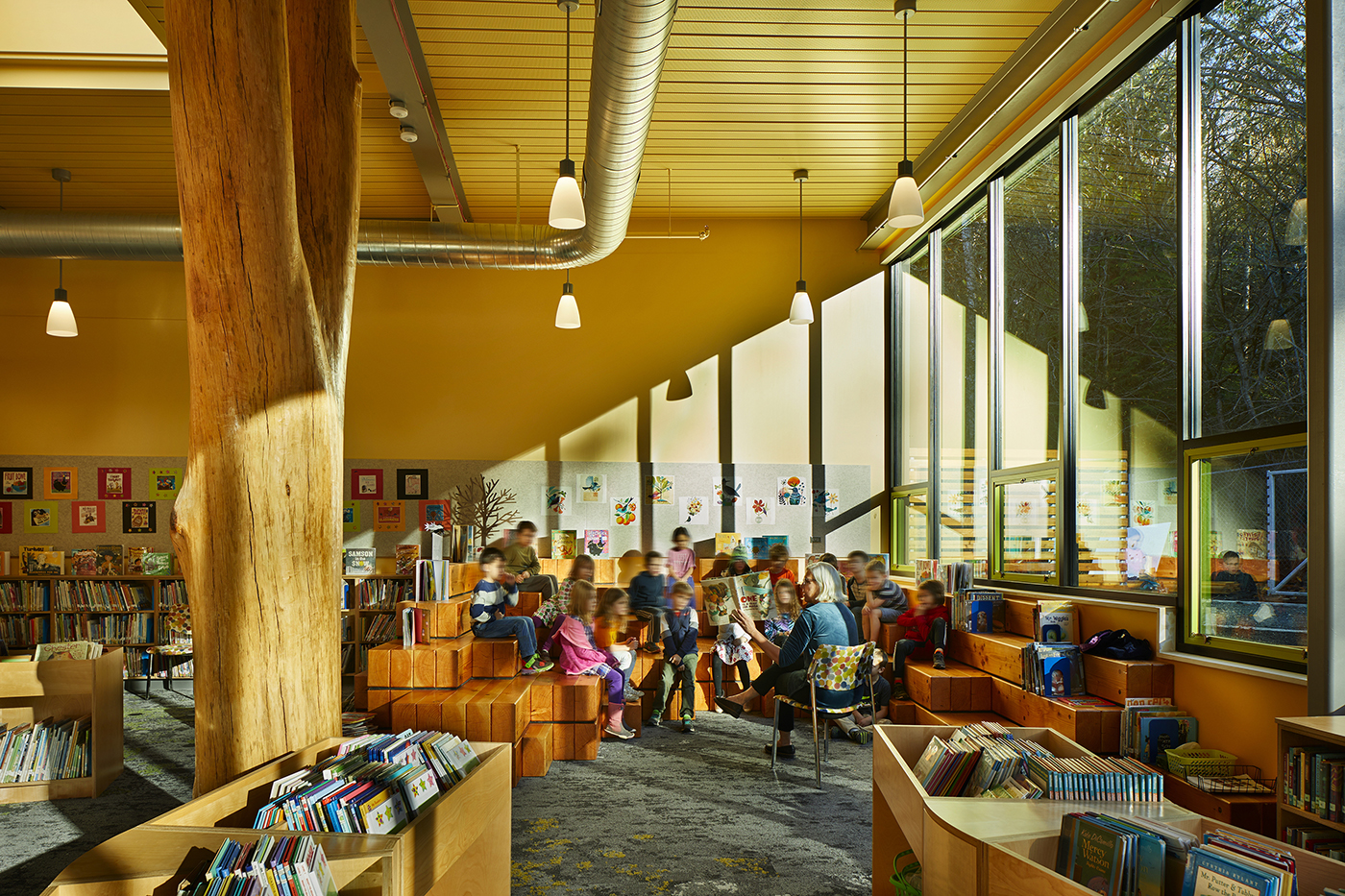 “When we think of our school as inspired by the forest, the library is certainly at the top with a full view of learning going on all around us while we curl up in ‘The Nest’ to share a story,” explained Blakely library media specialist Kathleen Pool. “It is a very natural place to listen, to use the imagination and to wonder. It is as if the room says ‘come and read...’ and the children do.”