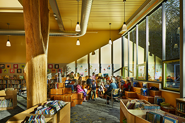 Located on a wooded site on Bainbridge Island, Blakely Elementary School is designed to bring nature into the learning experience through diverse outdoor environments and biophilic strategies. Completed in fall 2019, the replacement pre-K-4 school maximizes views from classrooms and the library toward an outdoor learning courtyard and forest beyond to reinforce connection to nature throughout the daily experience. Significant open area is restored to a native forest condition with stormwater management to protect wetlands on the site and the adjacent IslandWood environmental education campus.