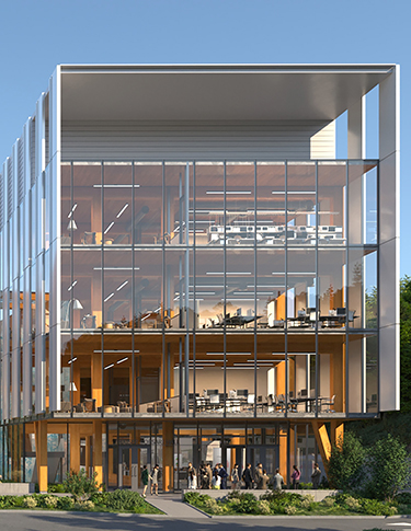 The new building will be four floors with a mechanical basement. It will integrate with the Communications Facility building at all floors through a direct bridge. Inside, functions will be stacked by floor: public space on the ground level, teaching on two, research on three, and offices and research on four. There also will be breakout spaces, a multicultural student lounge and a commons area.