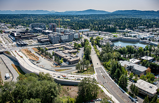 The gateway into BelRed, and backbone for area redevelopment, is Northeast Spring Boulevard. This new half-mile, five-lane roadway includes five intersections, two bridges crossing the Eastrail regional trail, and East Link light rail. There are also a multipurpose pathway, cycle tracks, parking and drop off zones, bioretention stormwater treatment, and a unique urban corridor.