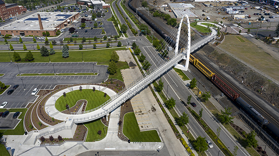When the city of Spokane began working on a university neighborhood master plan, the concept of constructing a pedestrian/bicycle bridge spanning the railroad tracks and connecting the East Sprague area to the University District emerged as a key catalyst in the master planning. This new connection now supports economic development for two vital and developing neighborhoods separated by railroad tracks and a busy arterial.