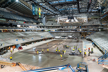 The construction team led by general contractor Mortenson poured about 400 cubic yards of concrete from over 40 ready-mix trucks to create the slab, which has rounded corners (28-foot radii) to meet NHL standards. The foundation for the 200-foot-long by 85-foot-wide slab started April 12, when crews poured a smaller concrete slab to define the rink's perimeter and shape. A sand base and warming floor were installed atop the first slab.