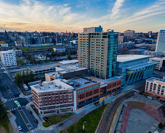 The Marriott Tacoma Downtown hotel is a 23-story, four-star hotel and mixed-use facility on a site adjoining the Greater Tacoma Convention Center. The site is sandwiched between the convention center and a 100-plus-year-old building, with the University of Washington Tacoma campus directly across the street to the south. The newly completed $126 million hotel has 304 rooms, as well as two restaurants, a 10,000-square-foot ballroom, 9,000 square feet of meeting rooms, swimming pool and spa. At the street level, there is 8,800 square feet of retail space, as well as a 534-stall parking garage. This new destination is part of fulfilling the city’s economic development goals to expand the capacity of the convention center with additional breakout spaces and hotel capacity to support larger events.