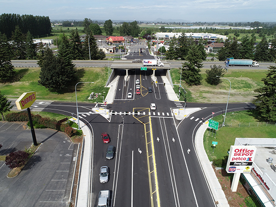 The College Way widening was a technical project that presented many challenges, requiring close partnership between Granite, the city of Mount Vernon and its designer, Reichhardt & Ebe. One of the biggest challenges was accommodating the vertical grade differences. With up to 2 feet of vertical grade differences between the existing roadway profiles and the new alignment along the on/off ramps connecting I-5 to College Way, the Granite team identified public-safety risks with the original traffic control plan that ran traffic alongside and through the ramp reconstruction efforts. The team introduced a 54-hour weekend ramp closure approach that kept the traveling public safe and reduced the overall project schedule. The northbound on/off-ramps were removed, regraded and replaced in a weekend and the southbound ramp was completed in a subsequent weekend. Local stakeholders were engaged in this process to develop and implement a robust public communication strategy, significantly limiting public impacts to just two weekends versus the original month and a half of temporary traffic stages. Closures were successfully completed ahead of schedule with public buy-in on the plan. Working underneath existing I-5 bridges presented both access and stabilization challenges. Unique equipment and access were required to ensure the existing I-5 bridge was not damaged. Additionally, ground stability with a spill-through bridge abutment above the work zone, which supported I-5 traffic, was a major concern. Granite and the owner developed a settlement-monitoring plan to track changes during construction. The geotechnical report for design was drastically different than what was encountered. The ground anchor walls underneath I-5 were designed to be built in six phases on each side, alternating panels in 5-foot lifts to avoid sliding and maintain structural integrity of the base beneath I-5. However, during excavation, Granite encountered dry screened sand that would not hold the wall face, so the team quickly worked through geotechnical ideas and solutions to stabilize the dry sand in the spill through abutment area. Due to low-overhead requirements, however, conventional methods of shoring were not feasible. A cost-effective solution, called Uretek, was chosen to use polymer injection to stabilize material so that the PGA wall face could be vertically stabilized for rebar and shotcrete application. Granite, the city, Reichhardt & Ebe and WSDOT worked quickly and efficiently together to increase the finish product quality and reduce the overall schedule.