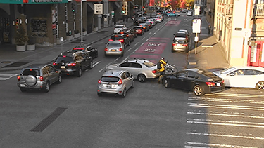 Six cars block the box at Fourth Avenue and Battery Street. This intersection is getting a traffic enforcement camera.