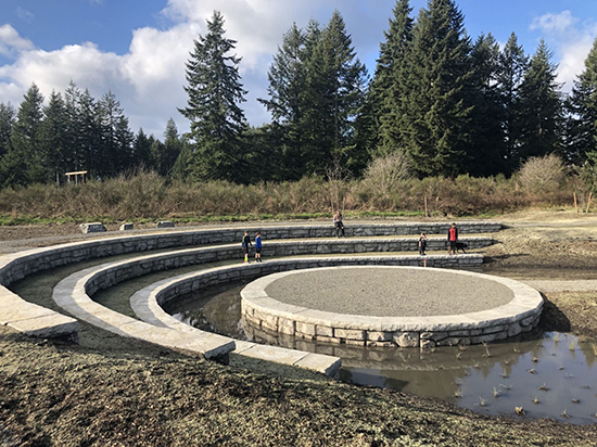 The small community of Rochester in the rural prairie lands of Thurston County and the Black River watershed suffered from multiple drainage and flooding issues. Herrera collaborated with Thurston County to develop a stormwater solution to reduce flooding, improve water quality treatment and provide the community with an amenity. The designers’ creative vision included a stormwater park that transformed a vacant land parcel into a peaceful natural area filled with native vegetation, a trail and an amphitheater gathering space connected to the adjacent athletic field and playground.