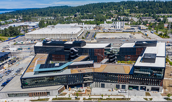 The REI Spring District headquarters project, located in Bellevue, consists of a three-building, 400,000-square-foot commercial office complex on an 8-acre campus. REI’s vision for its new headquarters and campus was to build a sustainable office that would connect the building occupants to the outdoors and the local neighborhood. The project, nestled in Bellevue’s mixed-use Spring District, features extensive courtyards, roof decks and glazing that connects the inner office space to the outdoors.