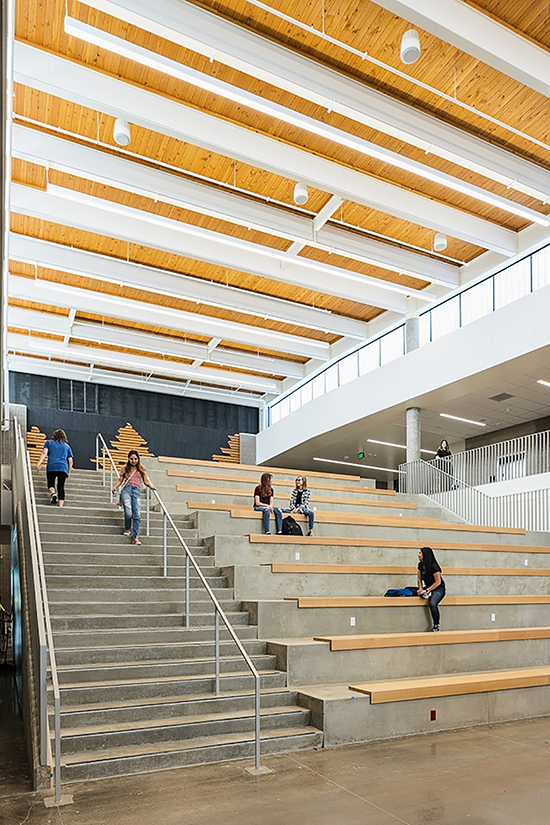 The new 150,000-square-foot Gardiner Middle School is uniquely designed with an open learning environment, creating a space that feels less confining than a traditional school of the past. The design incorporated sound panels to reduce noise levels throughout the building.