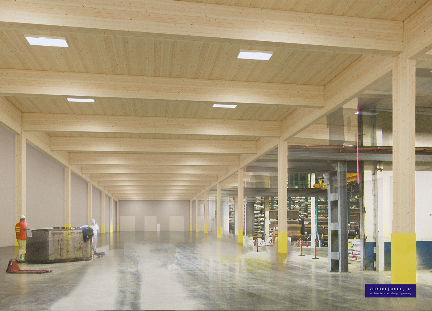 A structural life-cycle analysis of the project shows 1,600 metric tons of carbon dioxide reduction by using mass timber over steel for the structure. Another 1,600 metric tons of carbon dioxide is realized when considering the biogenic storage benefits of wood.