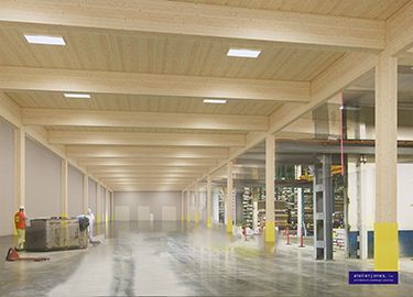The single-story warehouse will be built with cross-laminated timber panels, and glulam beams and columns. Project backers say this will be the first warehouse to use mass timber on a large scale in the Kent Valley, which is dominated by traditional tilt-up concrete/bar-joist and pre-engineered metal buildings.