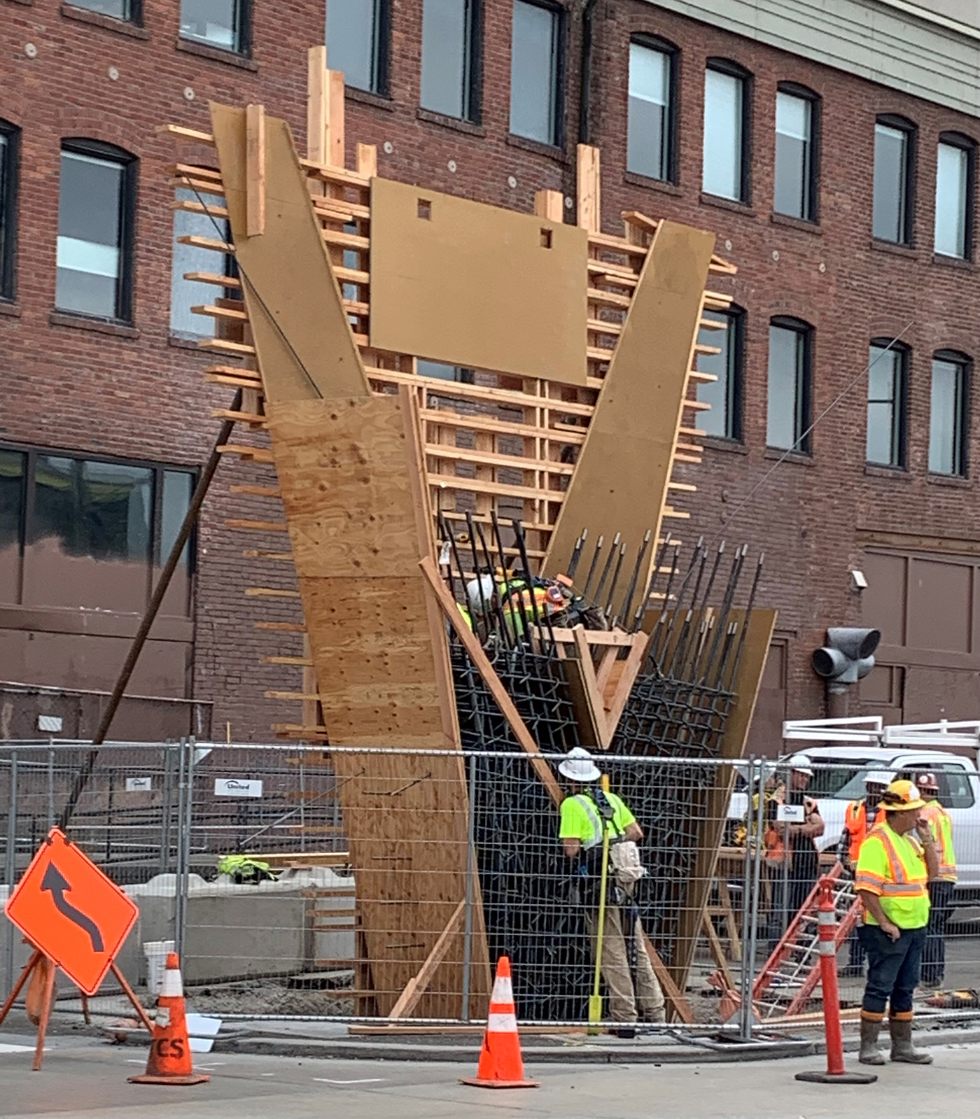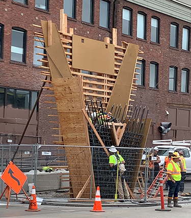 Two prominent parts of the new Marion Street pedestrian bridge are taking shape on both sides of Alaskan Way by Colman Dock. Here, crews from general contractor Flatiron have started formwork for the V-shaped columns that will hold up the elevated walkway's 110-foot span over the busy road.