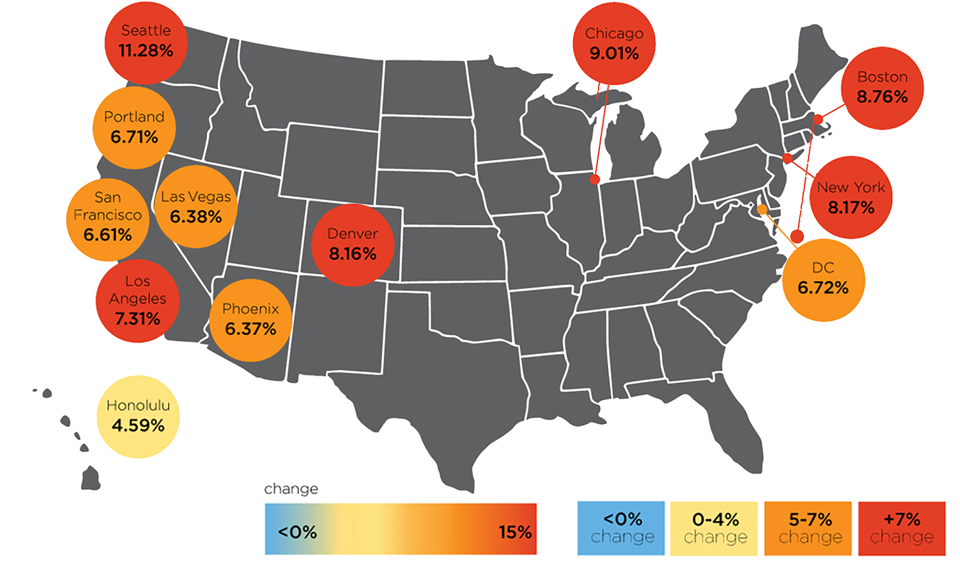 Seattle topped 11 other major metropolitan areas in the U.S. for yearly construction cost increases, according to a quarterly report released yesterday by construction consultant Rider Levett Bucknall. The report includes data to April.