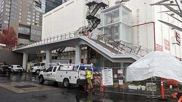 A much improved pedestrian link to the waterfront is expected to open early next month, according to Waterfront Seattle. The project consists of a new elevated concrete walkway and staircase on Union Street, connecting Western Avenue above to Alaskan Way below. It replaces an old metal stairway that rose along the wall framed by the Public Storage building to the south and the Seattle Antiques Market building to the north.