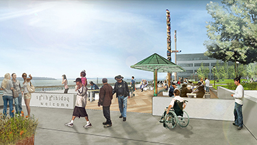 Landscape architecture firm Walker Macy designed circulation updates to create a connection to the MarketFront expansion south of the park, and an improved connection to the Tree of Life sculpture area. Walker Macy also incorporated Coast Salish elements into parts of the project, including column wraps on the new pavilion, Native welcome text at the entrance walls, and a special concrete path paving with a basket-weave pattern.