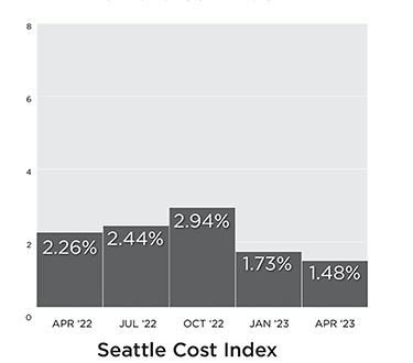 Construction cost increases for projects in the Seattle area were among the highest of 12 cities across the U.S. over the past year ending in April, but the short-term trend was more encouraging. That's according to the second quarter construction cost report recently released by consultant Rider Levett Bucknall.