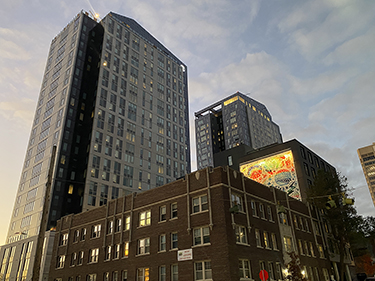 The two-towered, 25-story complex includes 412 units (1455 beds) and 7,600 square feet of retail. Amenities include a rooftop pool and hot tubs, fitness center with rock-climbing wall, virtual sports room and rooftop study lounges. The complex also includes a mid-rise building on Brooklyn, which is connected by a through-block pedestrian walkway. The building is pursuing LEED Gold.