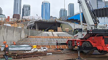 Hoffman Construction Co. is building Overlook Walk, which has two bridges that support an elevated park and walkway in an hourglass shape spanning Alaskan Way. Part of the structure sits atop Seattle Aquarium's Ocean Pavilion, also under construction and slated for completion this summer.