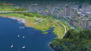 Already, the city has decided to rethink siting a new school on low-lying public land along False Creek, and is undertaking a project to define “blue-green systems” for stormwater infrastructure that can be implemented along streets in support of the Sea2City vision.