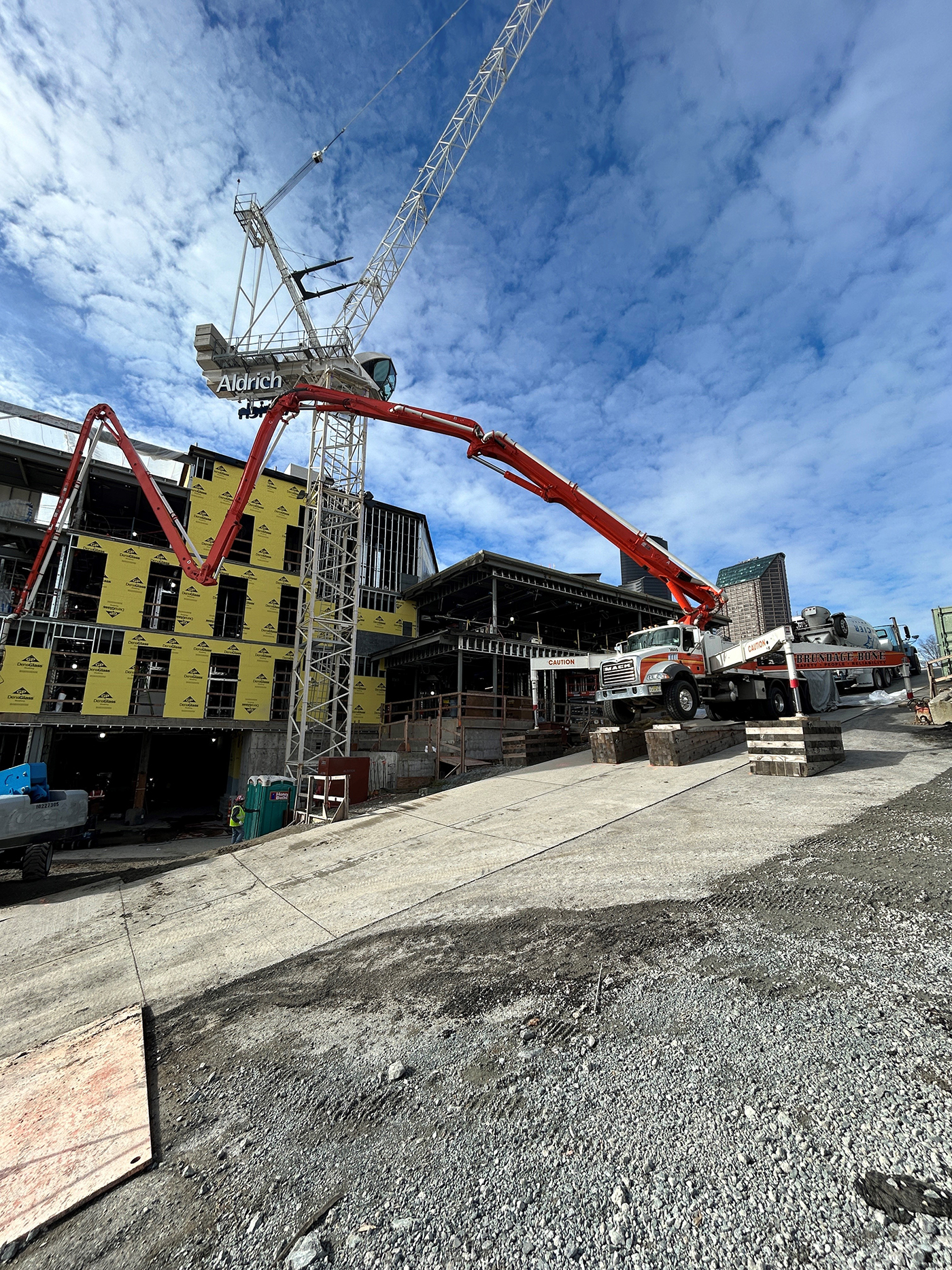 To safely work on the site's steep grade, Brett pioneered designs for a new interlocking ramp system to stabilize large trucks and cranes. The substantial 5-foot-tall blocks with 3-foot ramps leveled and supported pump trucks during concrete pours, worked perfectly for boom lifts, and are still being used as construction progresses.