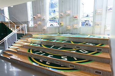 Inside, wood elements create contrast with the concrete. Bleacher stairs in the lobby are made from the reclaimed basketball court, affectionately known as the “Championship Floors.” The Storm won three championships playing on these exact maple boards in Key Arena.
