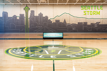 Outside, our drive to make spaces efficient resulted in a parking lot that doubles as a court, with two 3x3 half courts laid out in the parking lot. The lot is also part of the stormwater drainage system. City code requires the stormwater manhole covers to be labeled “storm.” We were able to get approval for each of them approximately 30 to be customized and labeled “Seattle Storm” with the outline of the Space Needle from the team’s logo.