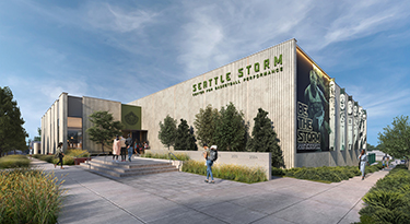 Seattle Storm’s new home in Interbay led to a design approach that is context-sensitive and that contributes to the neighborhood’s livability. As a rapidly developing area, Interbay’s light industrial legacy is evident in its warren of low-key streets, and its assemblage of low to mid-rise buildings and parking lots. It is missing the verdant tree canopy that characterizes the nearby Magnolia and Queen Anne neighborhoods.