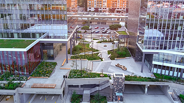 Comprising a series of interconnected rooms and paths, the landscape links the city’s east-west and north-south through-block connectors, enhancing pedestrian connectivity for a more walkable downtown. These “rooms” offer spaces for retail activities, building entries and gatherings. Terraces nestled within the sloping land break down the overall scale, providing views and relaxation. The largest room, situated on the western end, accommodates daily lunches, retail spillover and small events or performances. Seat steps and the upper terrace level help transition the elevation change across the site between buildings and capture sunlight throughout the day.
