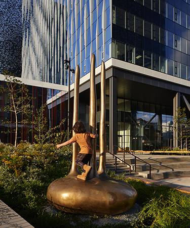 Throughout the garden at moments where people would converge or at moments of gathering, we imagined the potential for art that would be both inviting to touch and playful for children to have a central role.