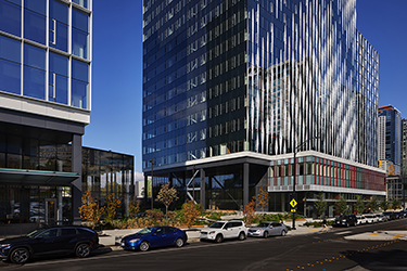 It was discovered early on that the project site was once traversed by a seasonal stream-bed Meydenbauer Creek which flowed toward Lake Washington. This inspired the integration of the concept of “flow” into both the site and tower designs. A subtle, flowing pattern was incorporated across all outward-facing facades, creating a rhythmic movement from tower to tower. At the podium levels, a similar flow pattern was applied directly onto the glass, using parametric modeling and digital printing technology to create a continuous design across the individual glass panels on each street-facing façade.