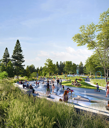 It quickly became apparent to all the partners in the project that eight parks in the initial “bundle” of Shoreline parks were too many to do simultaneously. The parks were re-bundled into three projects of two to three parks each on different permit and construction tracks. Learning from the permitting process what details will be acceptable means the team can “anticipate issues more quickly and push details further to relate to the conditions of each park. Standardization in details and specifications can be replicated and applied to other parks leaving more time to be creative in the play design experience,” Faris said. By pinning down aspects of the design that are familiar, such as play equipment and concrete detailing across all eight parks, it opens time to take on the more complex aspects such as splash pads.