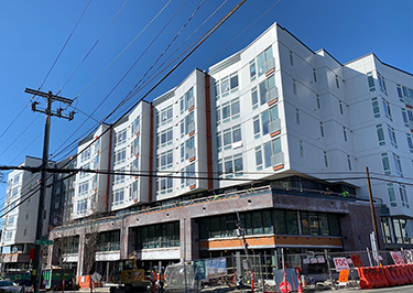 Rafn Co. topped out the building in October and has since completed exterior work on the residential levels. The contractor this spring was working on the podium's exterior.