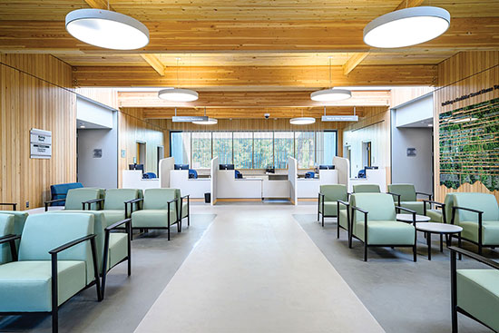 As stated by Mahlum, the facility "evokes a warm and inviting care environment. Our design team integrated wood products from the local timber industry which are showcased throughout the building. The clinic is also infused with daylight and views of the natural world beyond. Care Team Stations affectionately nicknamed ‘Wolf Dens,’ offer direct access to patients, facilitate collaboration, and provide staff respite.”
