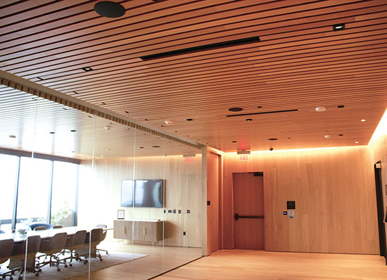 Although less complicated, the still delicate work of design, layout and construction of the linear wood ceiling was accomplished with a minimum of wasted material and time.