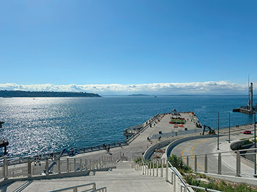 When entering Overlook Walk from MarketFront, there is a new overlook with 360-degree views projecting out from a planted bluff that has views of the downtown Seattle skyline, the mountains, the bay, the stadiums and Mount Rainier. From there you can take a staircase down or you can turn north to the Bluff Walk.