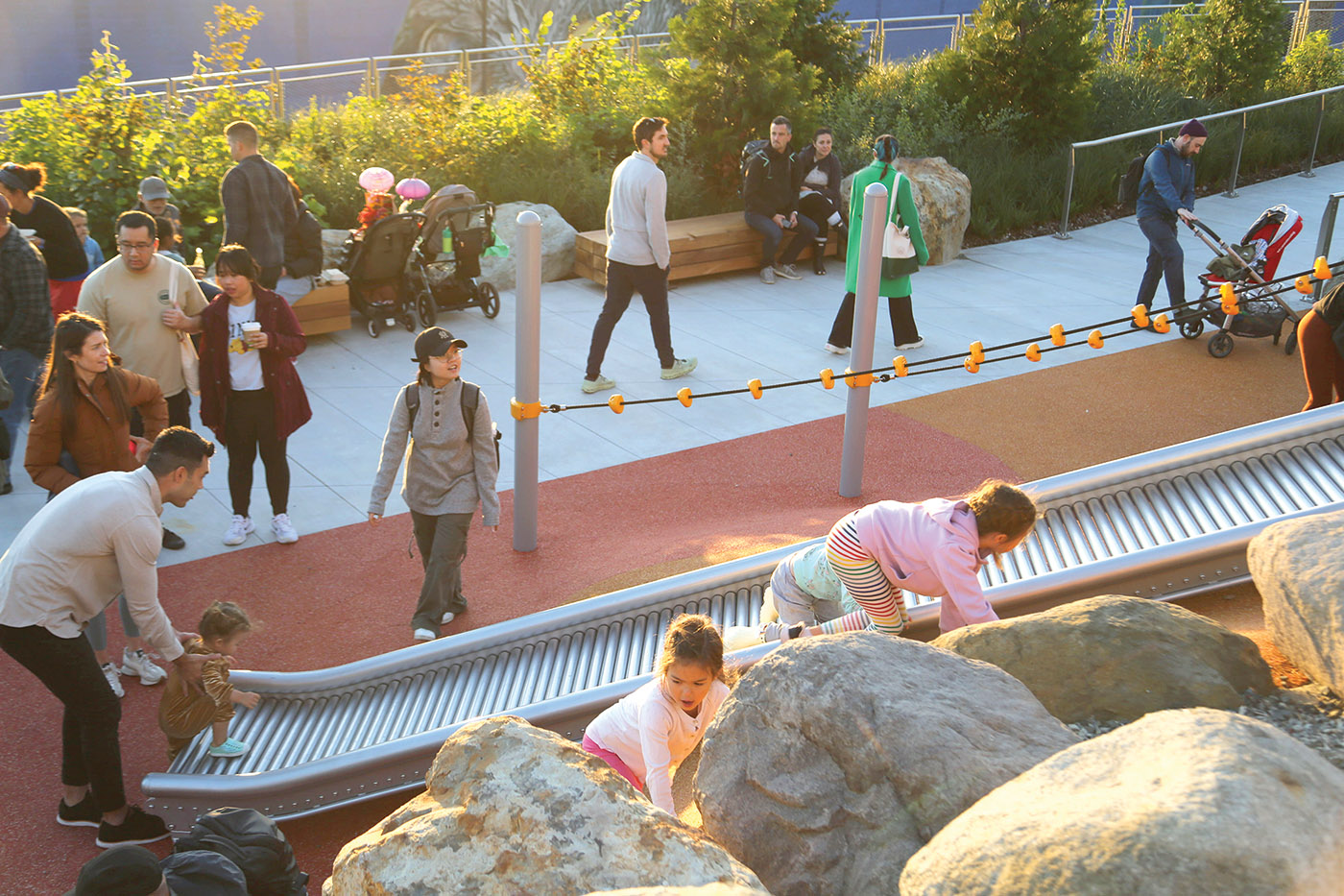This walk is surrounded by plantings you might see on a mountain hike. Ferns and evergreen trees lie to your right and as you look toward the water you see something surprising, a red and orange slope down the hillside. This is the Bluff Walk play area nestled on the slope between two walkways.