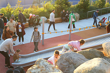 Overlook Walk binds these buildings together in a continuous pedestrian park that brings people down from the MarketFront to the waterfront through a series of gardens, playgrounds, plazas, overlooks, stairs and elevators. This walk helps pedestrians navigate 100 vertical feet from Pike Place Market and down the bluff that was in the past only accessible through a set of wood stairs. This new connection was the result of extensive coordination and detailed urban design and engineering solutions to achieve the welcoming and accessible connection it is today.