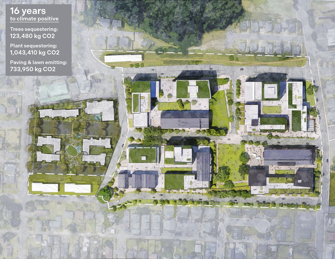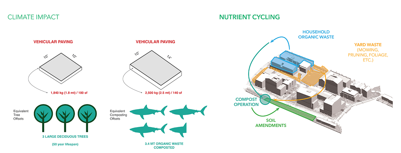 We achieved a significant reduction in carbon emissions by increasing deciduous trees by 20%, reducing vehicular concrete by 60%, and replacing half of a moderately maintained lawn with plantings and shrubbery. Also significant, this design option included taller buildings with smaller footprints to accommodate more green space.