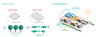 In earlier discussions, the design team developed three options with input from EHA; options varied with more or less green space, a different number of trees of different tree sizes, and so on. EHA was leaning toward a preferred option with more park space, and when the Pathfinder analysis showed that the preferred option was indeed the most climate positive, it solidified a decision to move forward with that concept.