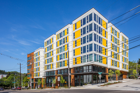 Maddux is a two-building, multifamily, affordable housing project located near Seattle’s Mount Baker light rail station. Maddux North is 110,000 square feet with 101 family-sized units. Maddux South has 102 efficiency units and is approximately 58,000 square feet. South McClellan Street, a busy arterial, runs between the north and south buildings, and the project included substantial street improvements. Maddux’s six and seven-story buildings include parking, offices and approximately 3,500 square feet of commercial space.