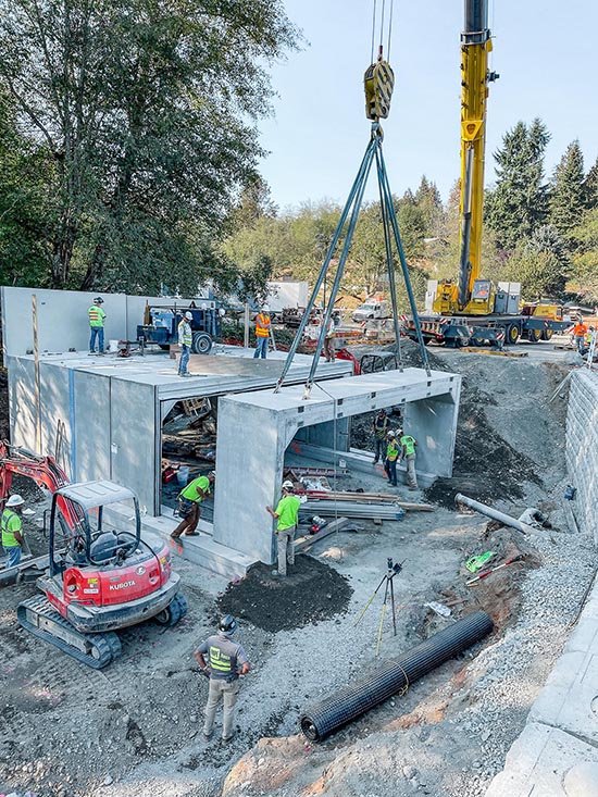 This involved utilizing rigid inclusions at the Lake Creek fish passage and over-excavation at the Norway Park fish passage. Furthermore, Faber’s previous experience with skewed culvert designs led to an engineered redesign that offered the installation of a MESA block wall in place of the bag walls/shotcrete. These innovative design modifications offered cost savings to WSDOT and subsequently, WSDOT has changed standard designs to offer block wall wing walls for future projects.