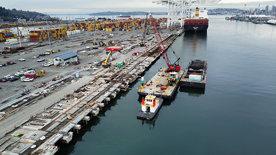 This project modernized a key terminal to handle ultra-large container ships, significantly enhancing the region’s shipping capacity. The job involved driving over 2,100 piles, including 350 that were 24 inches in diameter and more than 180 feet long. Seismic requirements and environmental restrictions, especially around underwater work, added to the complexity. Safety remained a top priority, with 100% participation in the Job Hazard Analysis (JHA) observation program. Four project leaders were awarded safety recognition pins by the Port of Seattle Safety Leadership Group in 2023.